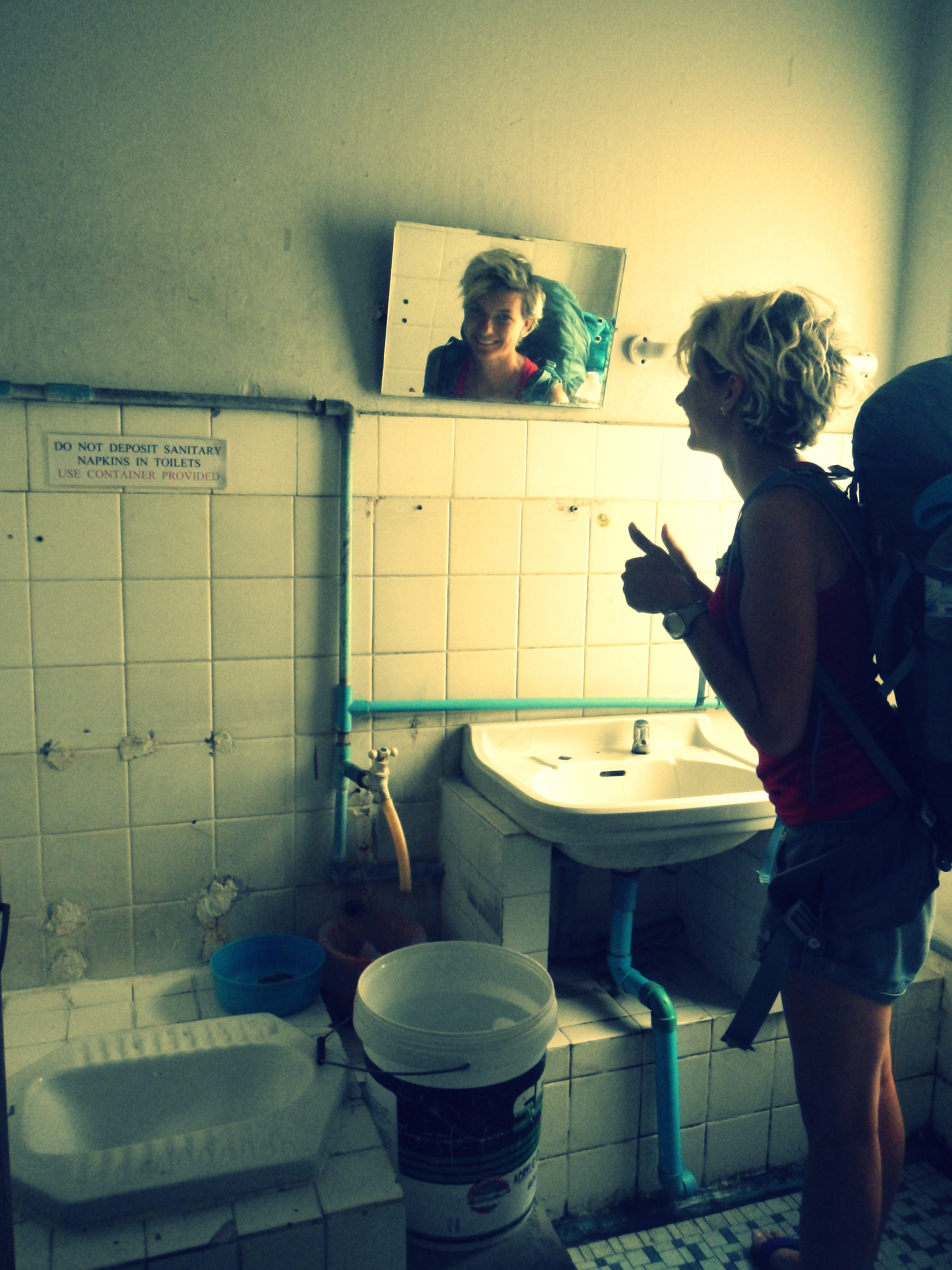 Iepazīšanās numur 1 – Āzijā pieejamās tualetes, jebšu flīzēts caurums zemē un tualetes papīra vietā ūdens špricējamā, dušas klausulei līdzīga, iekārta. Smaka atkarīga no tā, cik daudz ūdens iepriekšējais cilvēks atļāvies ar kausiņu no blakus atrodošā ūdens spaiņa ielaistīt “flīzētajā caurumā”.